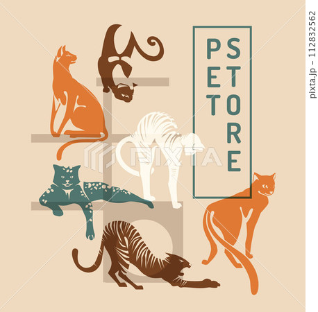 Set of different cats in poses. Risograph effect. Vector flat illustration