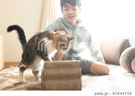 部屋でくつろぐ可愛いミヌエットと男の子
