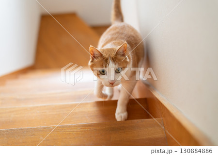 階段を上る猫 茶トラ白