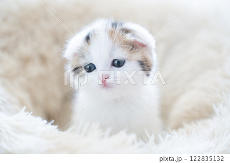 白いベッドに入ったスコティッシュフォールドの仔猫