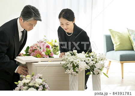 棺に花束を供えるミドルの男女 家族葬 自宅葬イメージ