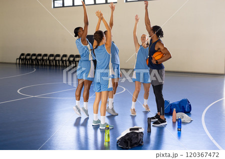 Basketball team practicing in gym, male coach holding ball and giving instructions