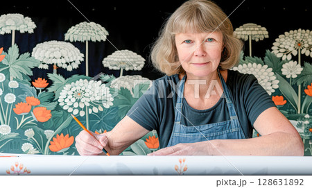 Female artist painting floral design on fabric with vibrant colors and intricate details