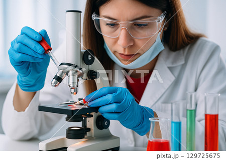 AI generated image of a female scientist in gloves using a pipette to drop red liquid onto a microscope slide symbolizing precision research innovation and dedication