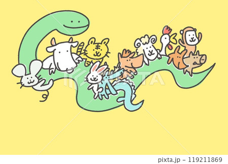 蛇に乗る可愛い干支のイラスト 十二支 年賀状素材 2025 手描き