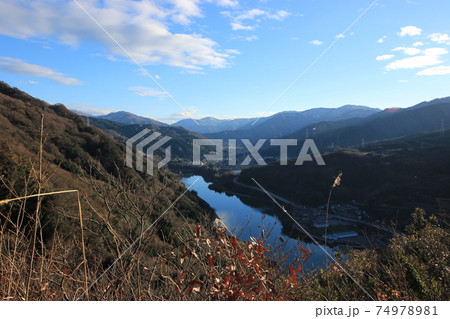 雪晴れの只見湖の湖面と田子倉ダム、寝観音 福島県只見町