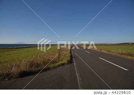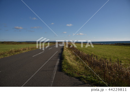 地平線まで伸びる果てしなく続く直線道路 北海道猿払村 エヌサカ線