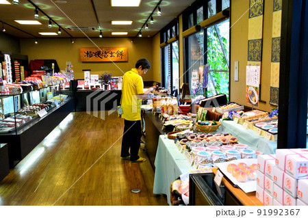 大月駅の観光案内所のお土産屋さんで買い物をする女性観光客