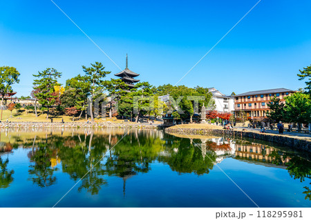 秋の紅葉と興福寺五重塔と猿沢池と青空