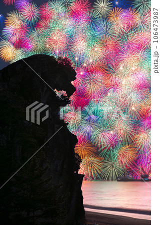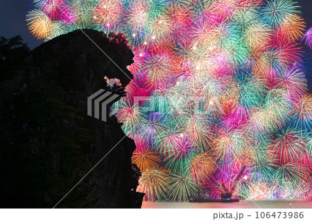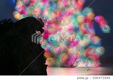 世界遺産 獅子岩に上がる花火 熊野大花火大会