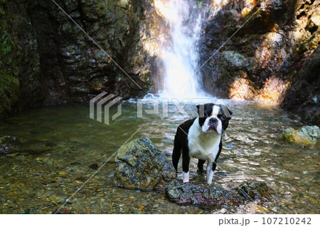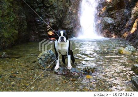 ゆずの里毛呂山町の獅子ヶ滝の渓流で見つめるボストンテリアのマイティ君♡
