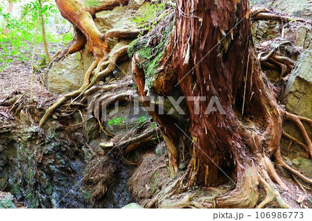 ゆずの里毛呂山町の獅子ヶ滝下流の岩肌に根を張る力強い杉の巨木の風景