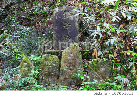 毛呂山町の森林の岩壁に囲まれた獅子ヶ滝の入り口の獅子ヶ滝の石碑と苔むす道祖神の風景