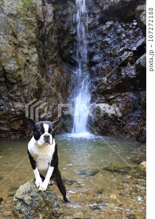 毛呂山町の獅子ヶ滝で後ろ脚で立って渓流を見つめるボストンテリアのマイティ君♡