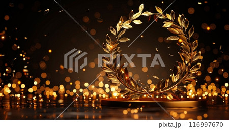 A golden laurel wreath, symbolizing victory and achievement, rests on a pedestal amidst a shower of sparkling golden confetti.
