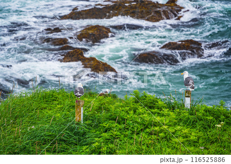 【北海道・浜中町】 霧多布岬(湯沸岬) 岩場の草地に停まった、オオセグロカモメ