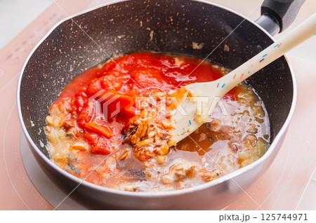 玉ねぎと鯖の水煮にホールトマトを加えて煮る