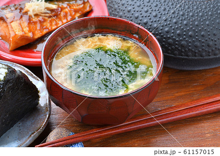 注意)汁の湯気はレタッチ合成です。和食料理。サバの味噌煮、かき玉汁(あおさ)、ひじき煮、おにぎり。