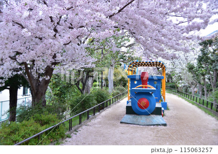 杉並・下高井戸の玉川上水第三公園の桜並木と蒸気機関車の遊具