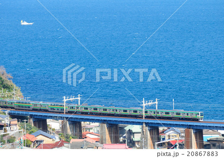 相模湾を見下ろす鉄橋を行く東海道線の普通電車