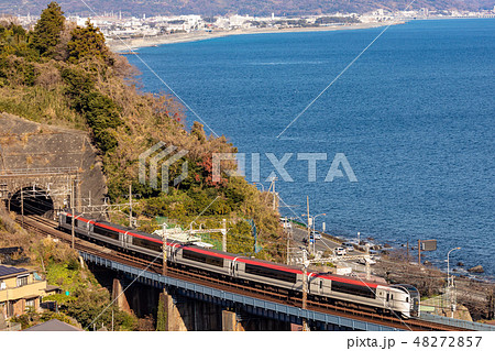 相模湾を見下ろす鉄橋を行く東海道線の特急スーパービュー踊り子号