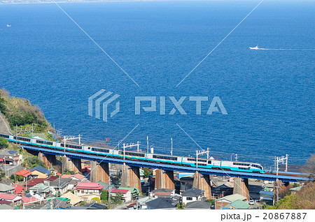 相模湾を見下ろす鉄橋を行く東海道線の特急スーパービュー踊り子号