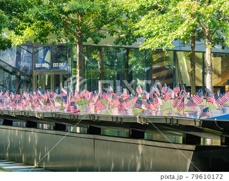 Close up shot of many America flags on the 9/11 Memorial South Pool