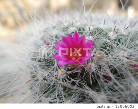 白い棘の中にピンクの花を咲かすサボテン_玉翁