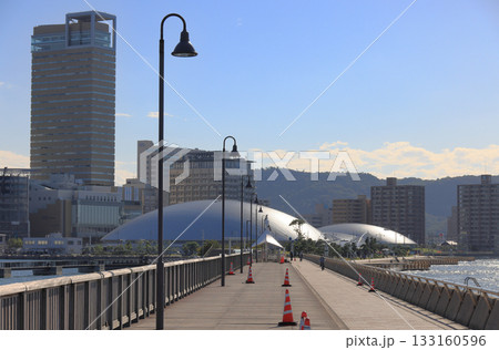 サンポート高松に完成間近のあなぶきアリーナ香川(香川県立アリーナ)を玉藻防波堤から見る