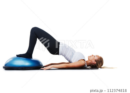Woman, half ball and bridge exercise for pilates practice, studio workout or core strength development. Balance challenge, fitness and sports athlete doing abs training on white background floor