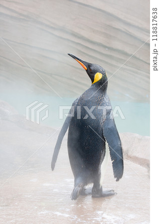 ミストの中で気持ちよさそうにする動物園のベンギン
