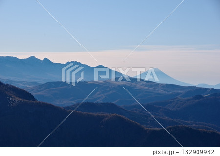早朝の美ヶ原より八ヶ岳連峰と富士山を望む