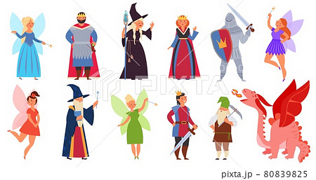 Fairy tale clipart. Medieval magician characters, cartoon fairy girl dragon and fantasy wizard. Halloween clothes, child book story decent vector set