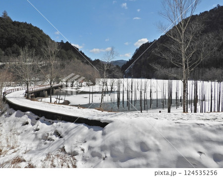 立枯れの樹木が林立する王滝自然湖の早春の景色