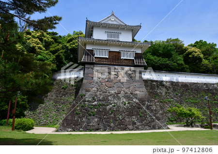 【長崎県】晴天の大村公園の板敷櫓と花菖蒲(玖島城)