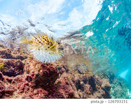 膨らんで水面を漂う美しいハリセンボンの半水面撮影。ヒリゾ浜中木南伊豆町伊豆半島静岡県2024