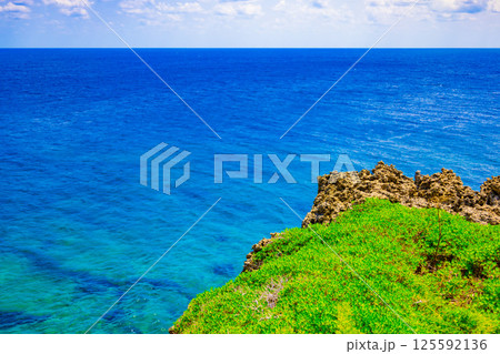 沖縄県辺戸岬の台地、岩、草、海、サンゴ