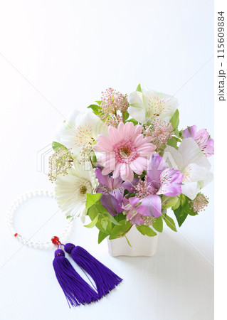 紫の菊の花と数珠とふくさ袱紗 葬儀葬式のイメージ素材