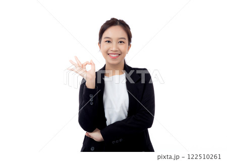 Portrait young asian business woman in suit gesture ok with confident and achievement isolated.