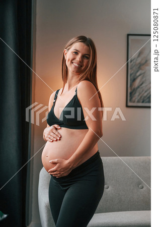 Standing and having positive mood. Beautiful pregnant woman is indoors at home