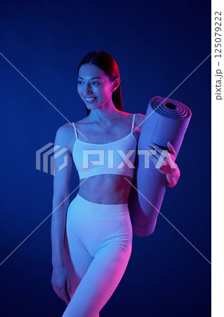 Ready for exercises. With yoga mat. Young woman in sportive clothes is in the studio with neon lights