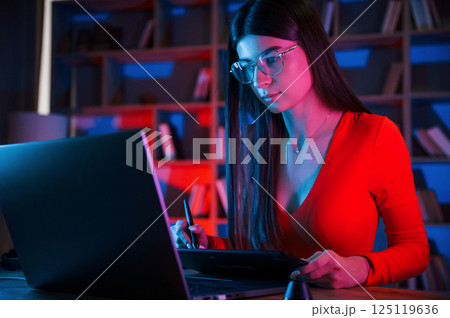 Young female retoucher working with computer and graphic tablet in neon lighting office