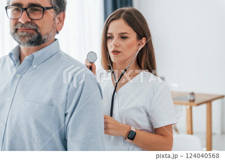 Woman using stethoscope and listening lungs of the man. Professional medical worker in white coat is in the office