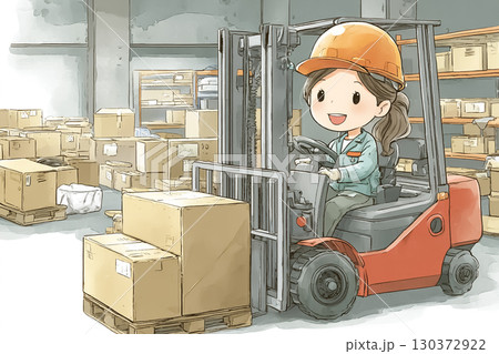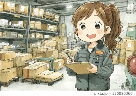 美優シリーズ:倉庫で仕分けをする美優の絵本調イラスト