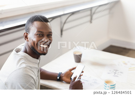 Smiling man using smartphone at cafe table with coffee and documents, copy space