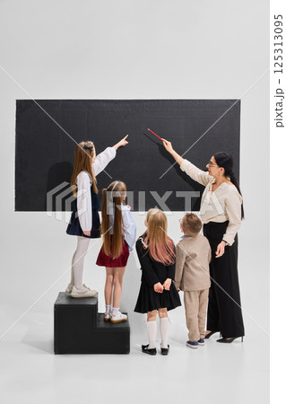 Children and teacher standing near blackboard, girl pointing upward while others observe. Concept of collaboration