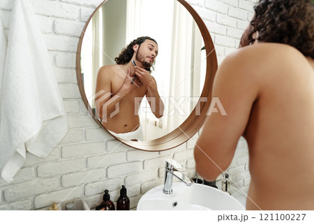 A man with curly hair grooming himself in the bathroom while looking into a round mirror