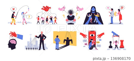 Manipulation and control people. Psychological phenomena, domination method, mental influence, abusing, hand marionettes, puppets bullying and harassment, tidy vector cartoon isolated set