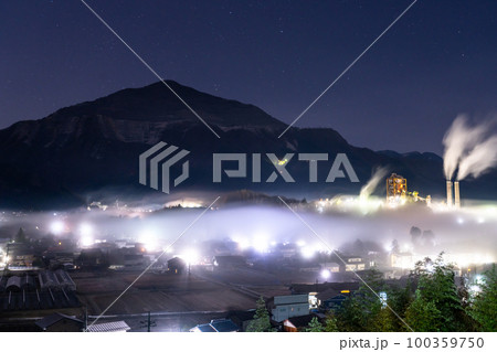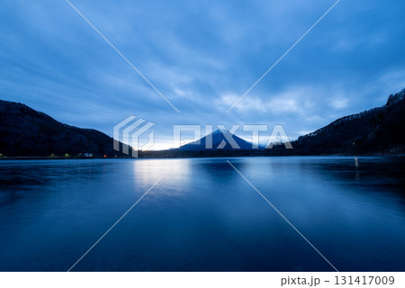 (山梨県)車のライトが湖上の霧を照らし、幻想的な景色になった精進湖と富士山