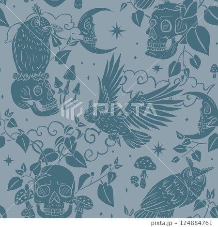 Seamless pattern with hand drawn inky eagle owls sitting on human skulls